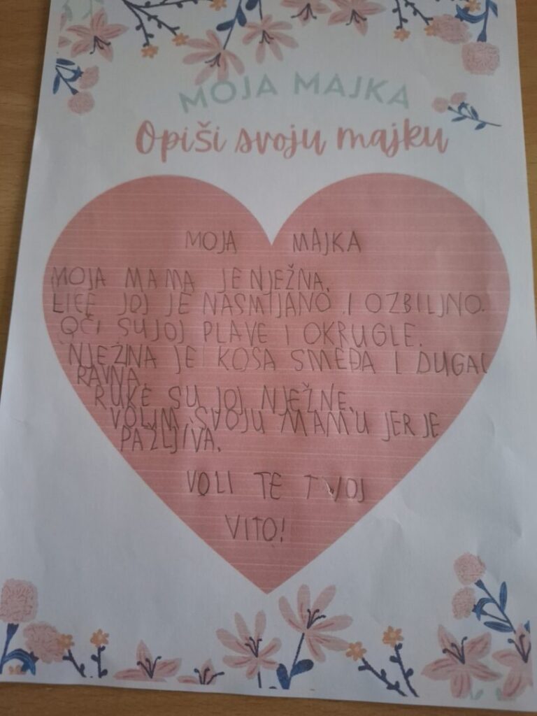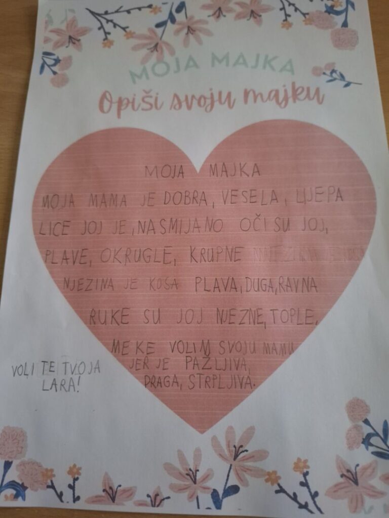 Učenici 1.b razreda izrađivali su poklone za svoje majke. Modelirali su vaze, koje su ukrašavali, te napravili jedan veliki reciklirani cvijet (stari plastični noževi, ostaci krep papira). Na satu Domaćinstva izradili su jedan veliki cvijet od kolaž papira. Na satu likovnog slikali su portret majke osnovnim i izvedenim bojama. Napisali su sastavak Moja mama, a na satu glazbenog pjevali smo pjesmu Mojoj mami.