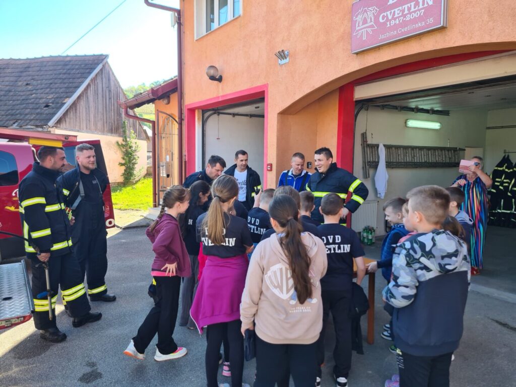 Nakon vježbe, učenici su posjetili Dobrovoljno vatrogasno društvo Cvetlin. Tamo su ih vatrogasci dočekali s predavanjem o pravilnom ponašanju u slučaju požara, poplave i potresa. Učenici su imali priliku upoznati se s vatrogasnom opremom, vozilima, a posebno ih je oduševilo isprobavanje zaštitne opreme i – špricanje vode!